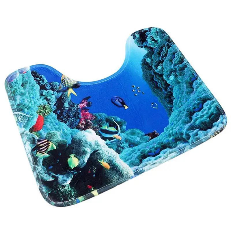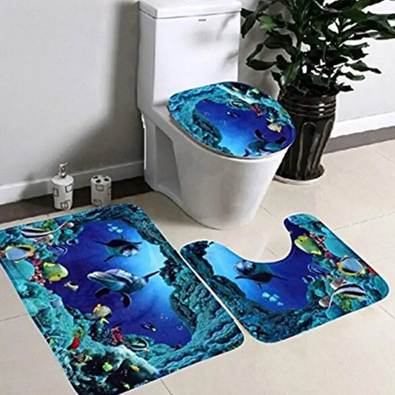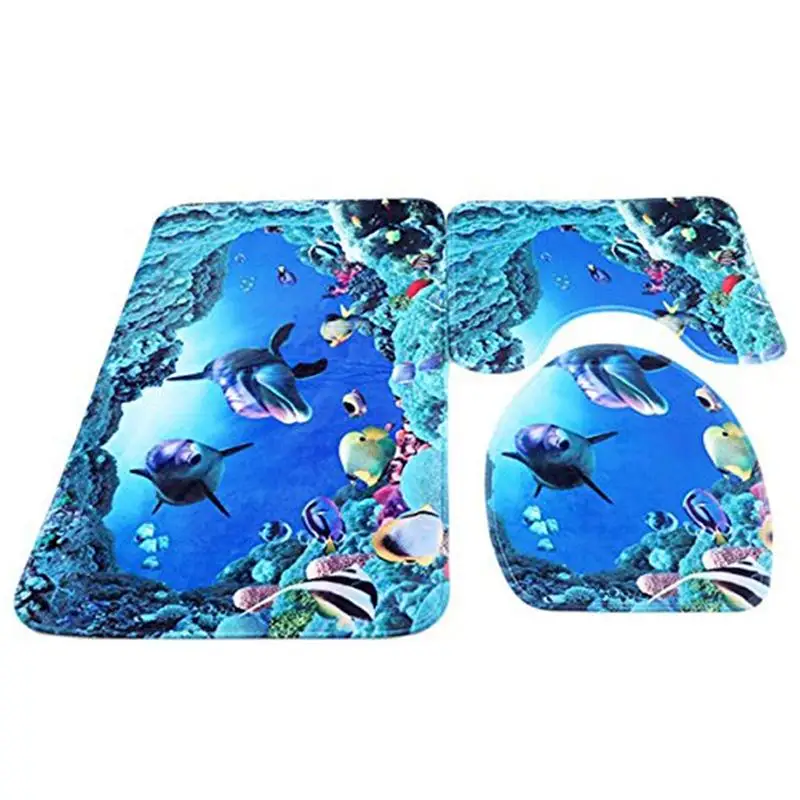 Bath Rug Set 3-Piece Mat Antislip Bath Rug + Floor Rug + Toilet Cover Underwater World Blue