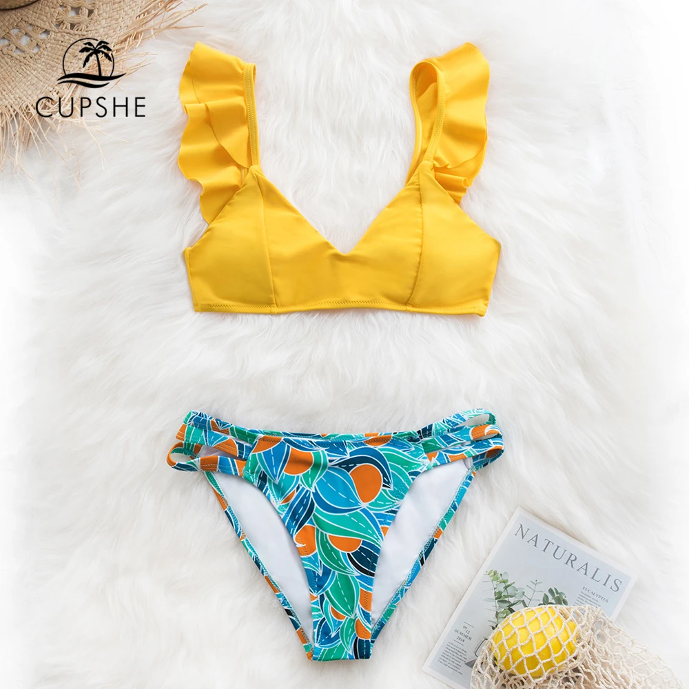 CUPSHE Yellow and Clementine Print Bikinis Sets Women Sexy Ruffles V-neck Swimsuits Two Pieces Swim