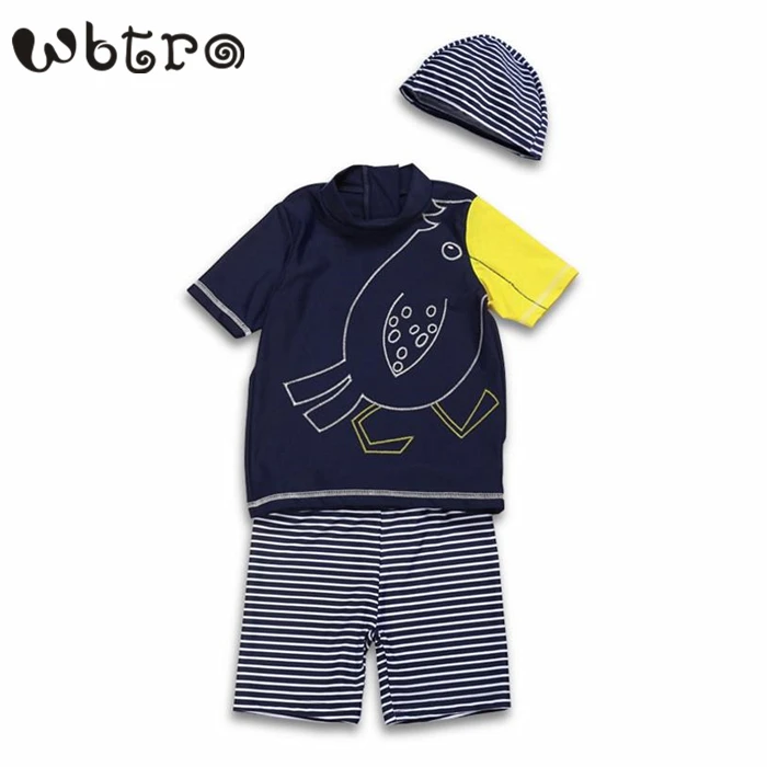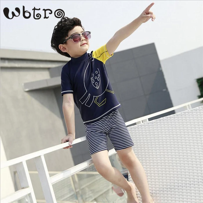 BEST QUALITY WBTRO Children Boy Two-Piece Swimsuit with Swim Cap Boys Short Sleeve Swimwear Kids Striped Bathing