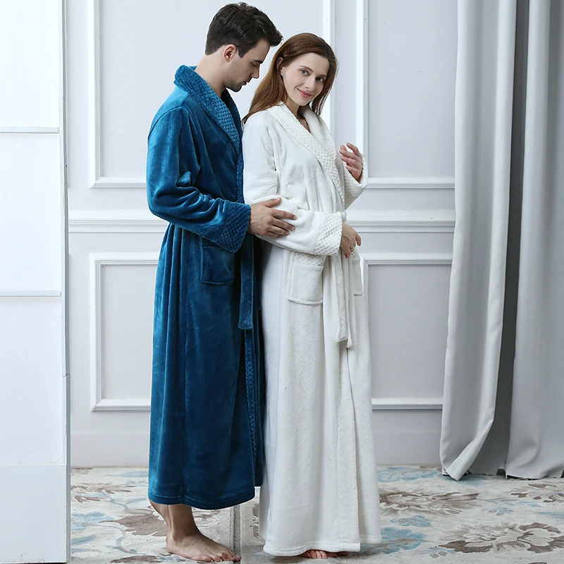 Women Men Thermal Luxury Flannel Extra Long Bath Robe Winter Sexy Grid Fur Bathrobe Warm Kimono Dre