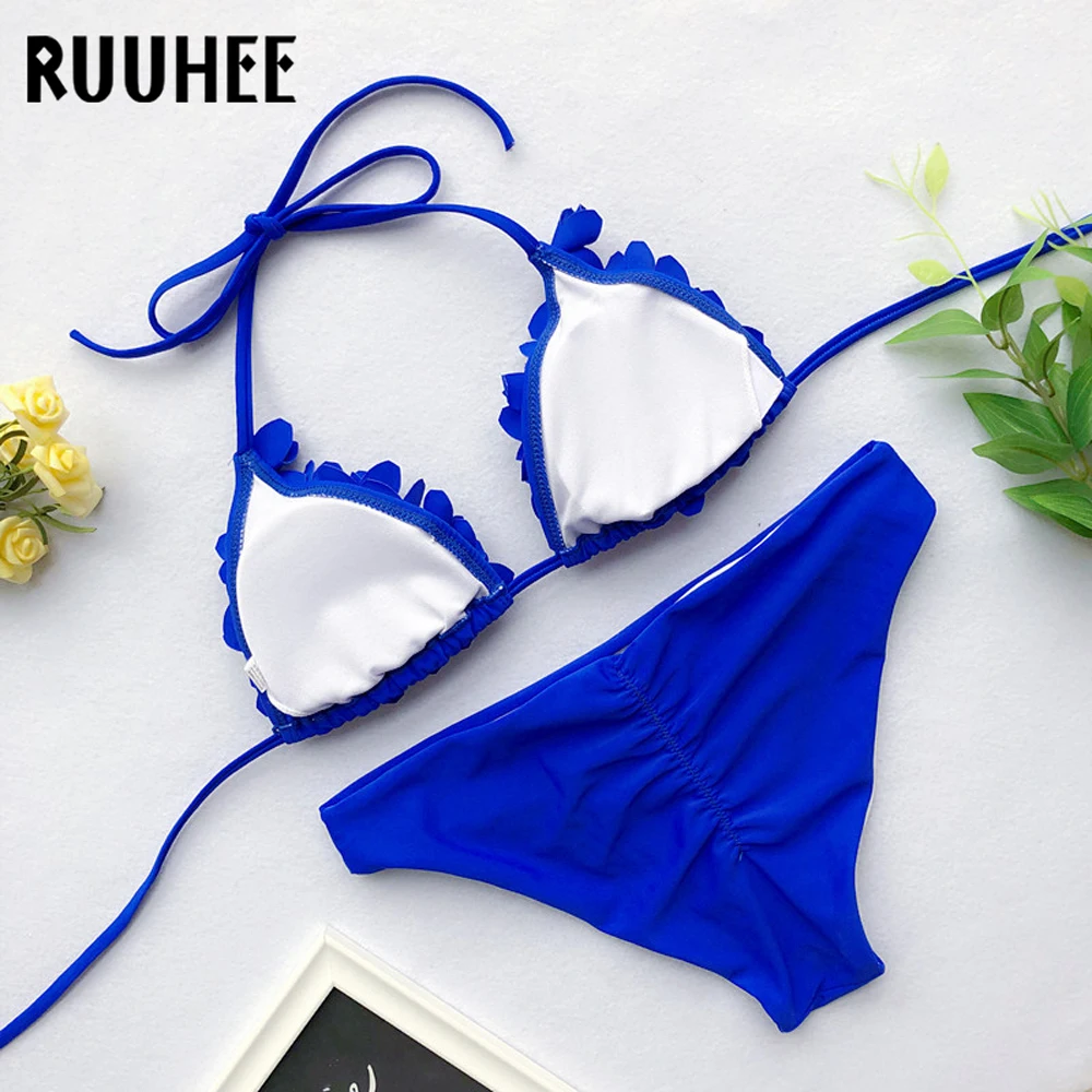Review RUUHEE 3D Floral Ruffled Bikini Swimwear Swimsuit Women Sexy Brazilian Bikini Set Halter Bathing Su