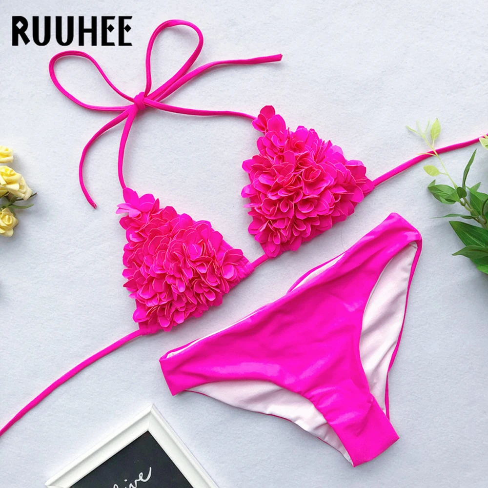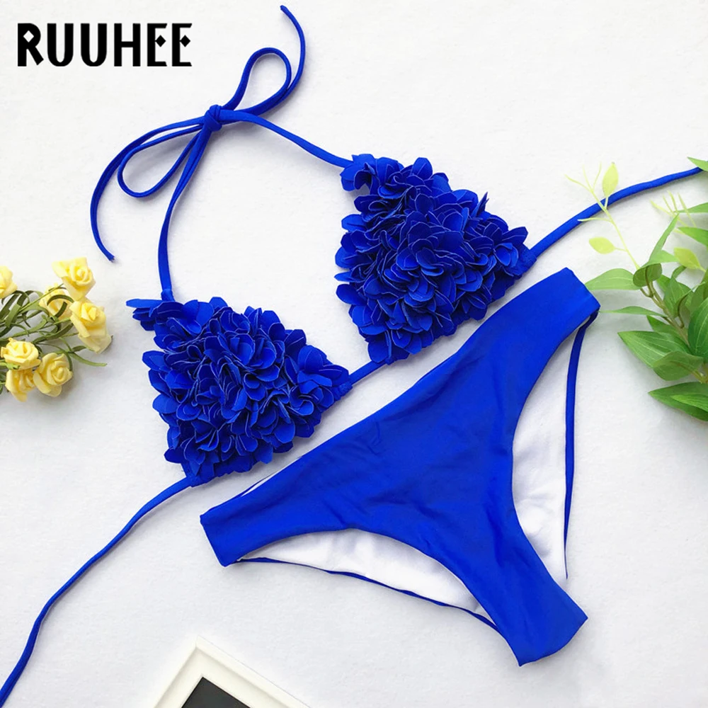 RUUHEE 3D Floral Ruffled Bikini Swimwear Swimsuit Women Sexy Brazilian Bikini Set Halter Bathing Su