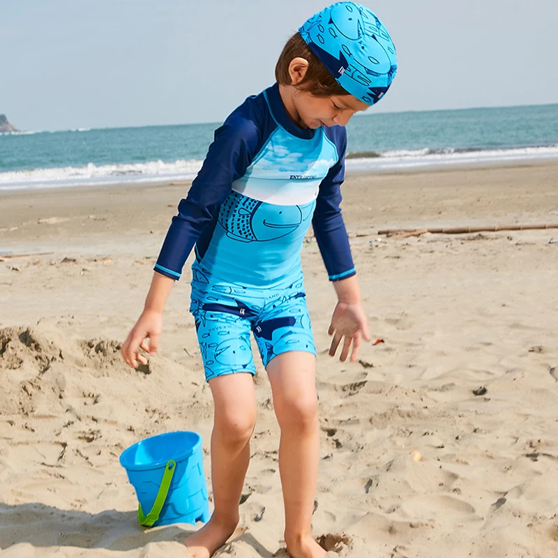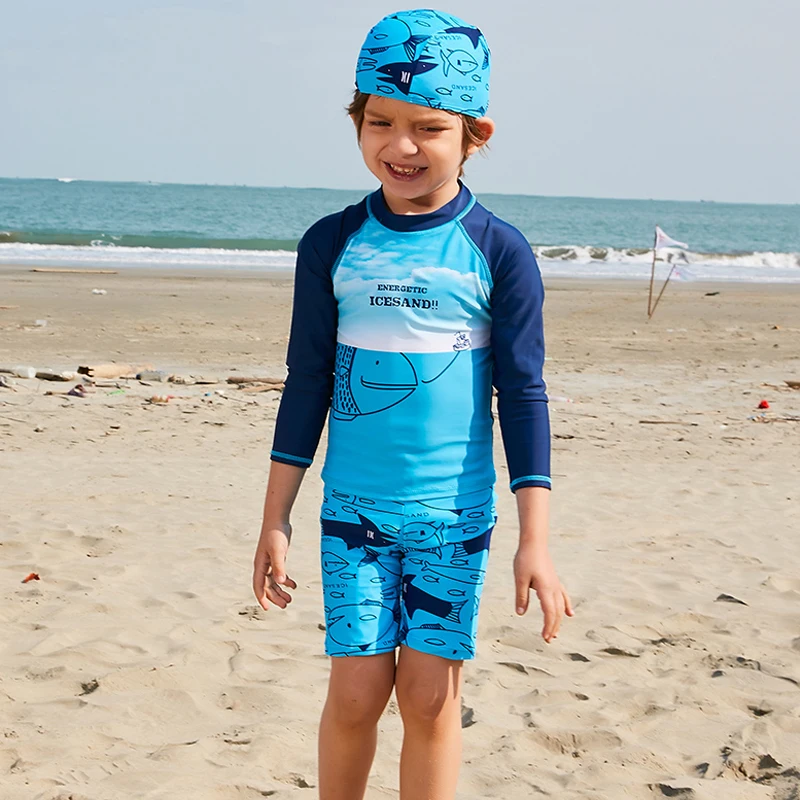 Boy Swimwear Two Piece Shirt Boxer Shorts Swimming Cap Cartoon Print kids Children Baby Swimsuit Ba